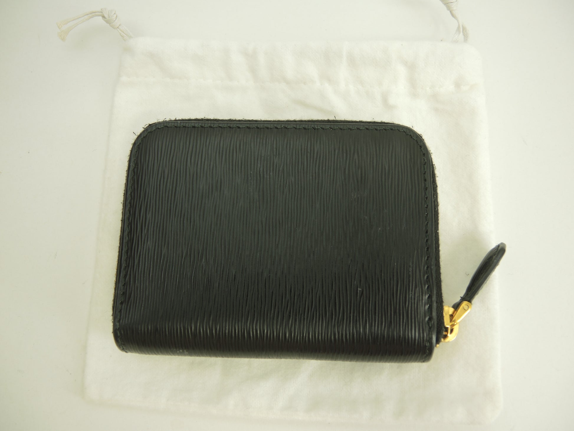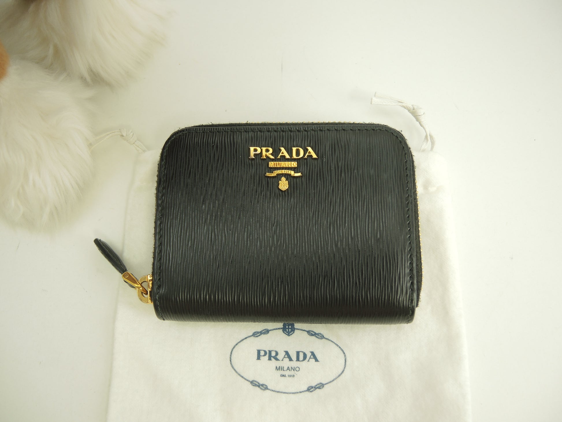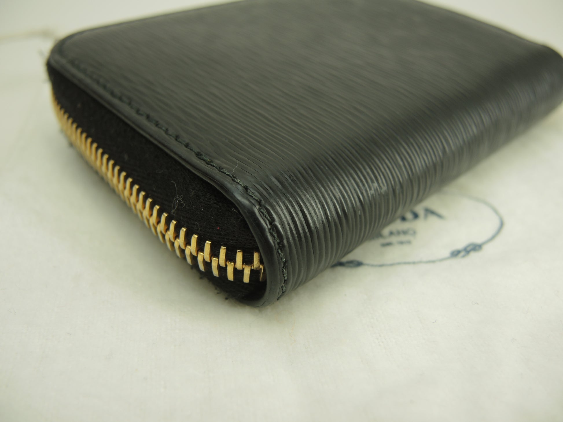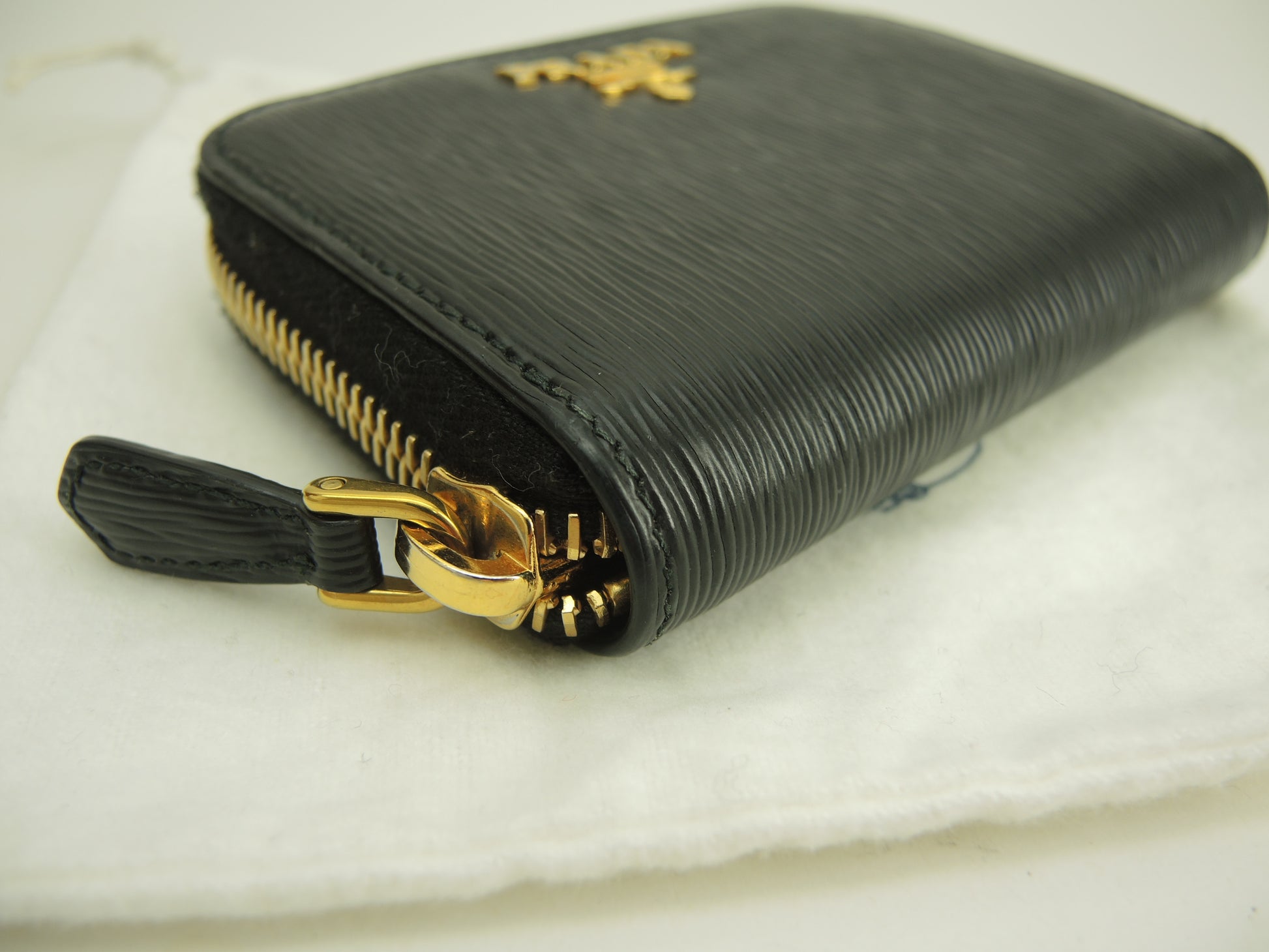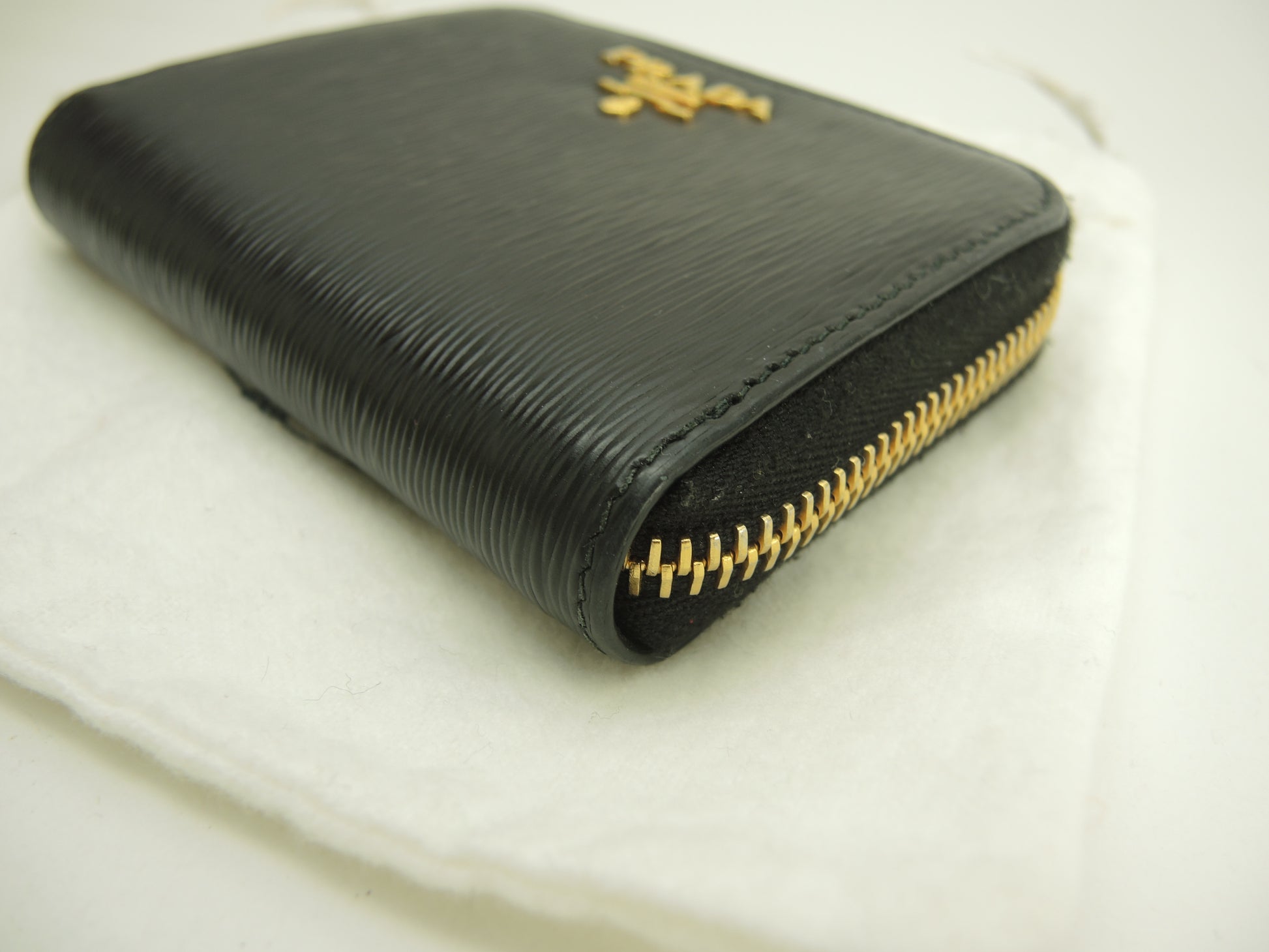 プラダ コインケース 縦縞レザー黒 ゴールド金具 ジップ小銭入 立体ロゴ@42A
