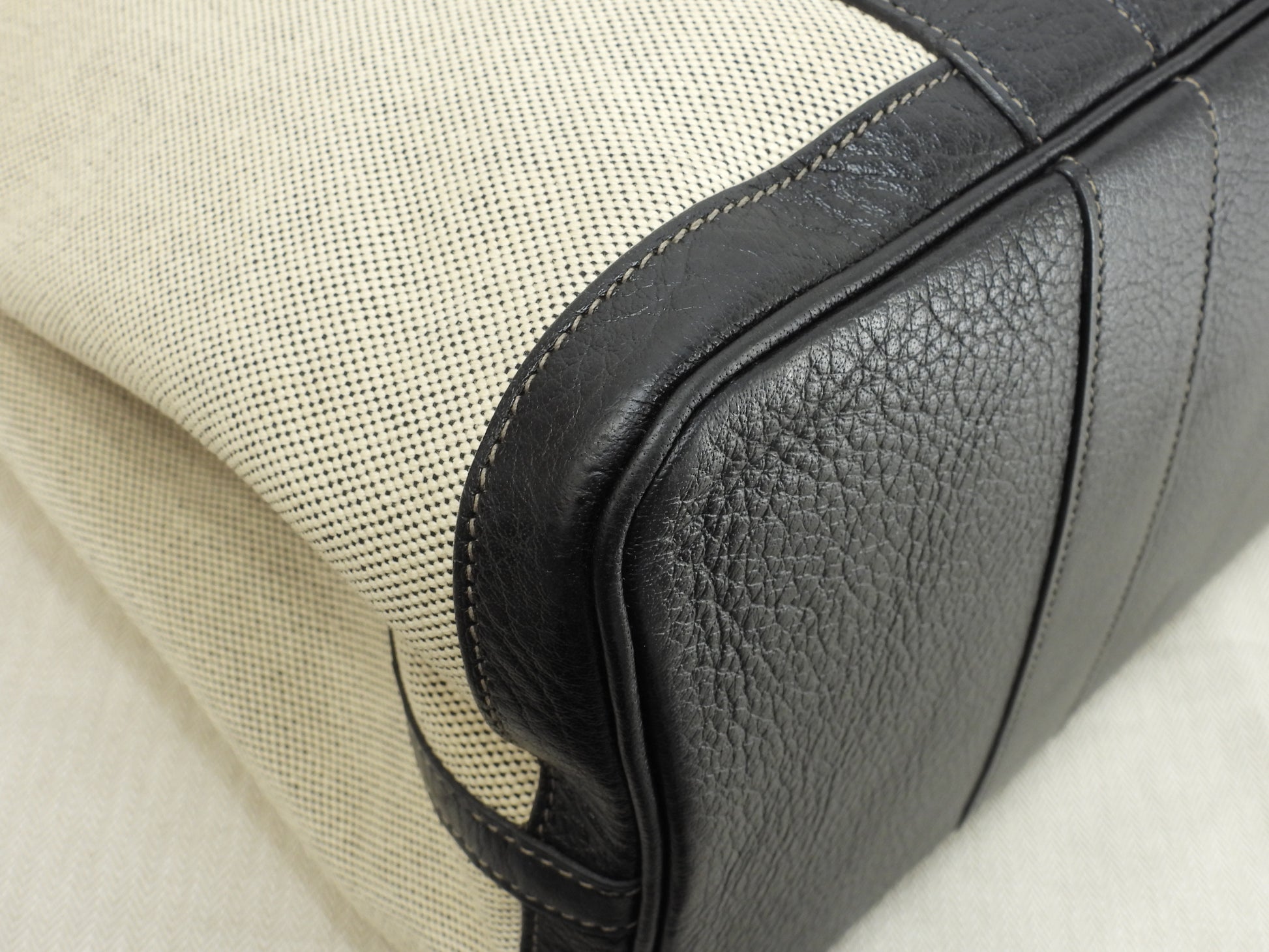 情報 : ボディは経年の黄ばみが全体的に薄くあり、レザー脇に製造過程のボンドのはみ出しが少しございますが、汚れもなく綺麗なほうです。底部角に薄スレ・薄汚れが少しございます。ハンドルはスレ・汚れ・弱りもなく状態は良いです。バッグ内はシミ・汚れもなく綺麗です。金具部分は薄スレ・小傷が少しございますが、メッキ剥げもなくピカピカです。