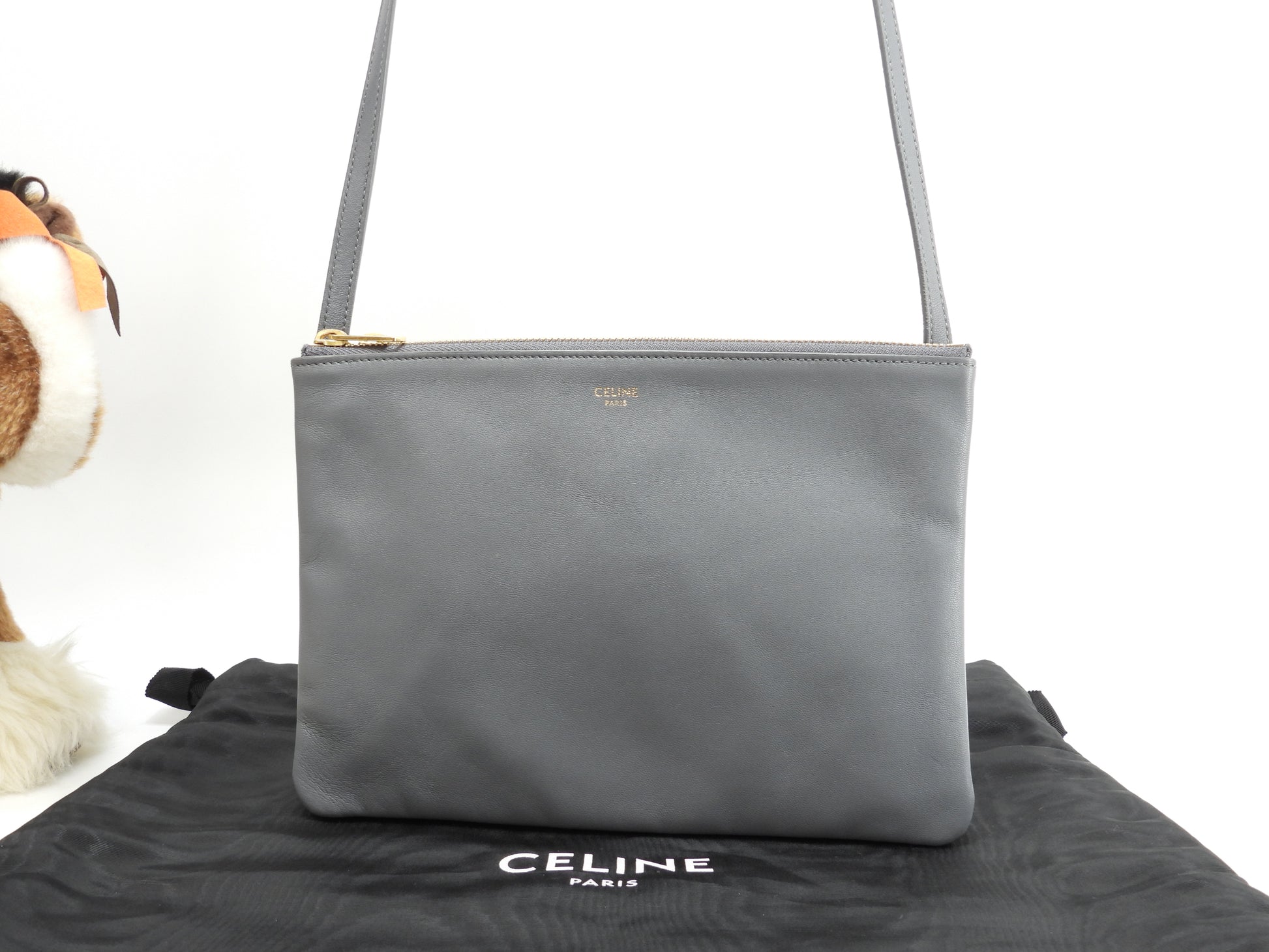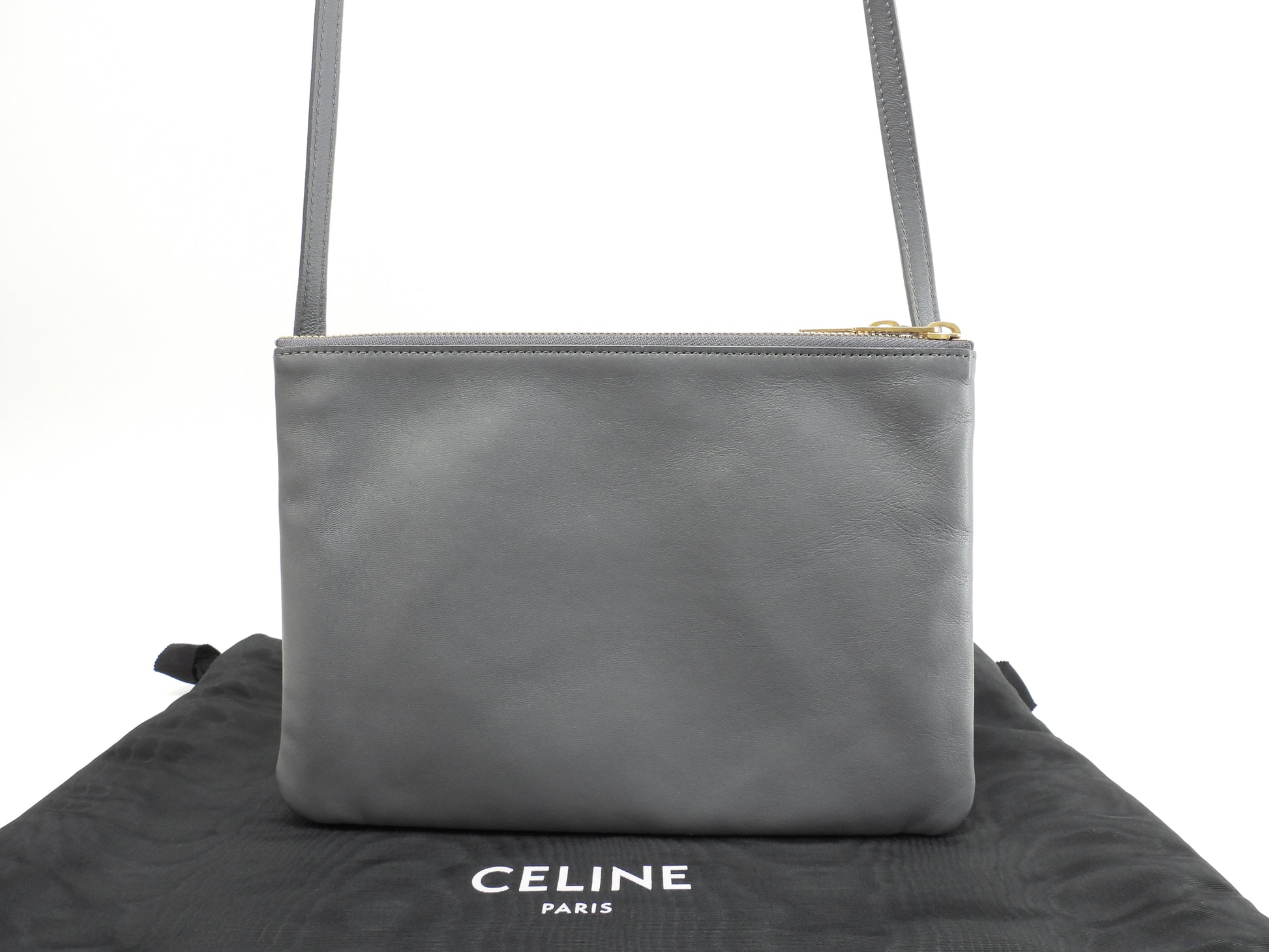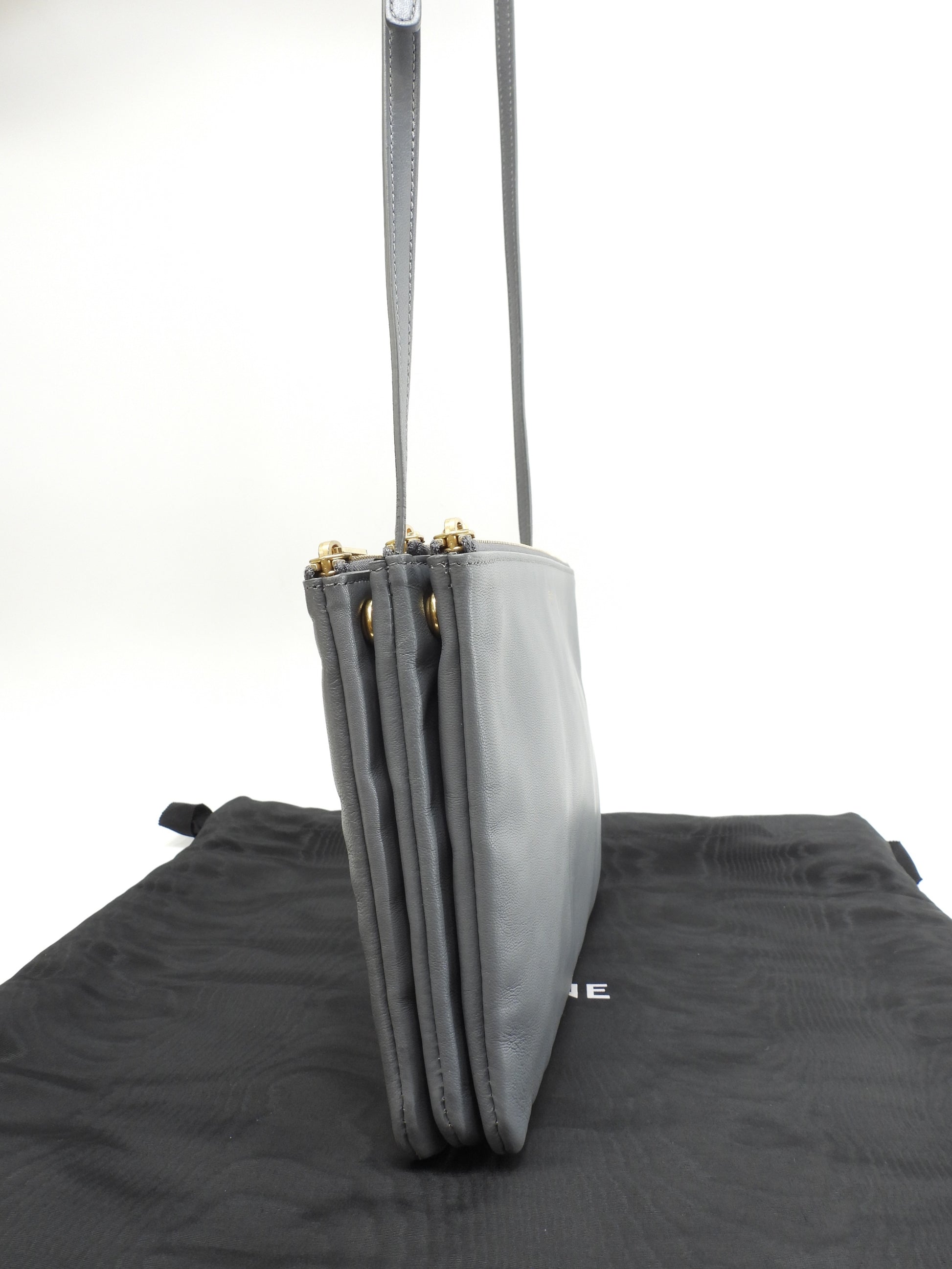 セリーヌ トリオ ラージ スムースレザー灰 クロスボディバッグ ポシェット 極美品@S-CU-2159