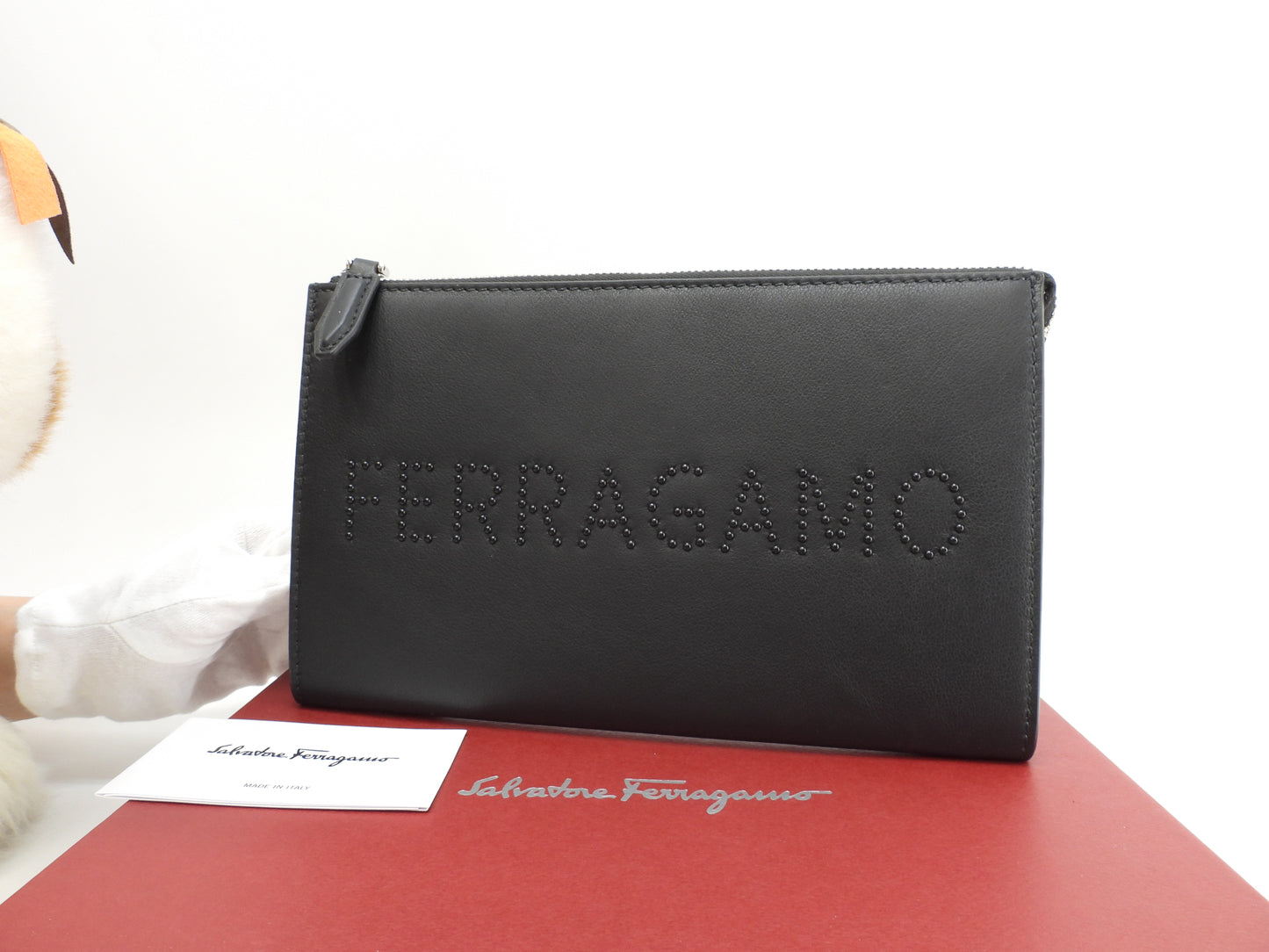 サルヴァトーレフェラガモ クラッチバッグ ドットロゴ レザー黒 ポーチ 新品@IY24A121 2